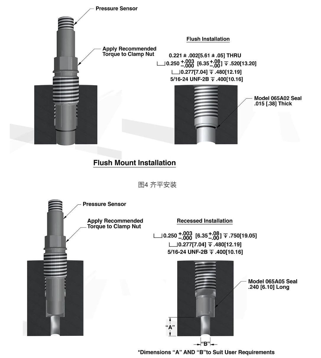 板上或者墻上采用齊平安裝壓力傳感器,宜于減少湍流,避免空穴效應,或避免室內容積的增加。嵌入式安裝適宜于壓力傳感器膜片可能會受到超高瞬時溫度或者粒子對撞的應用中。壓力傳感器采用嵌入式安裝將減低測量的高頻能力。這種安裝方式的空穴效應通常會降低傳感器的共振頻率。如圖4典型的齊平安裝 。